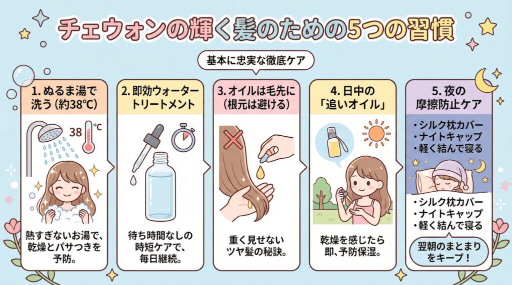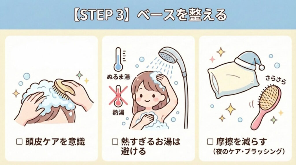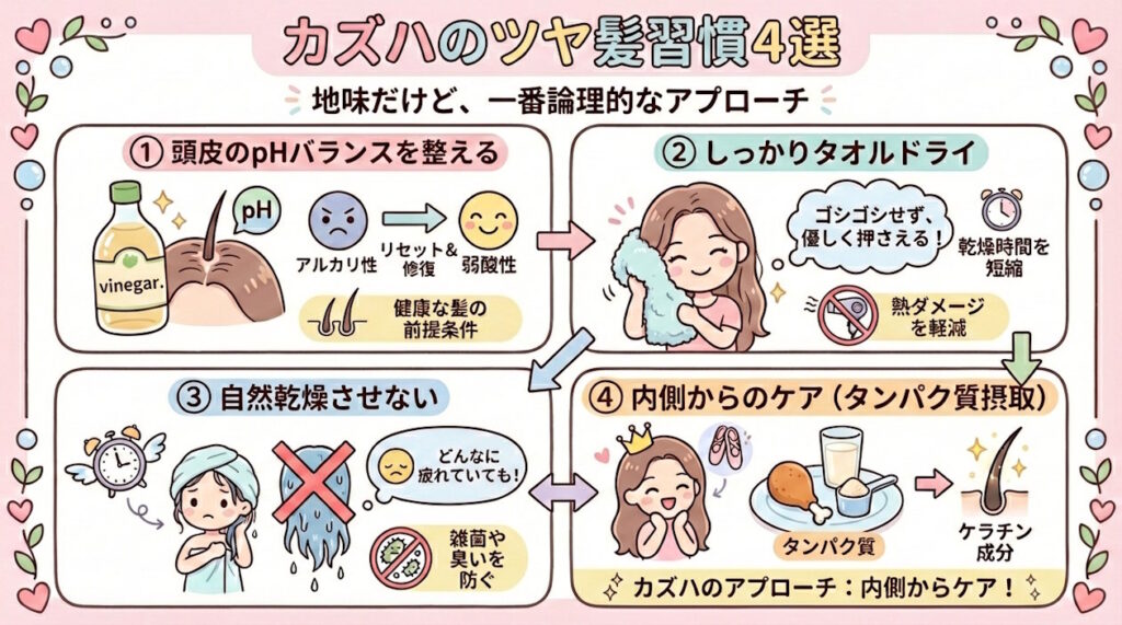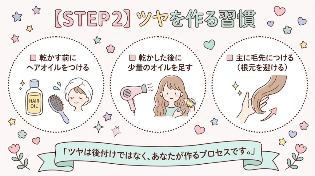 今日から真似できる「サラツヤ髪ルーティン」を、わかりやすくまとめています。