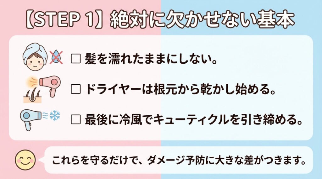 夜の完全乾燥 × 摩擦対策 × 前髪キープ管理