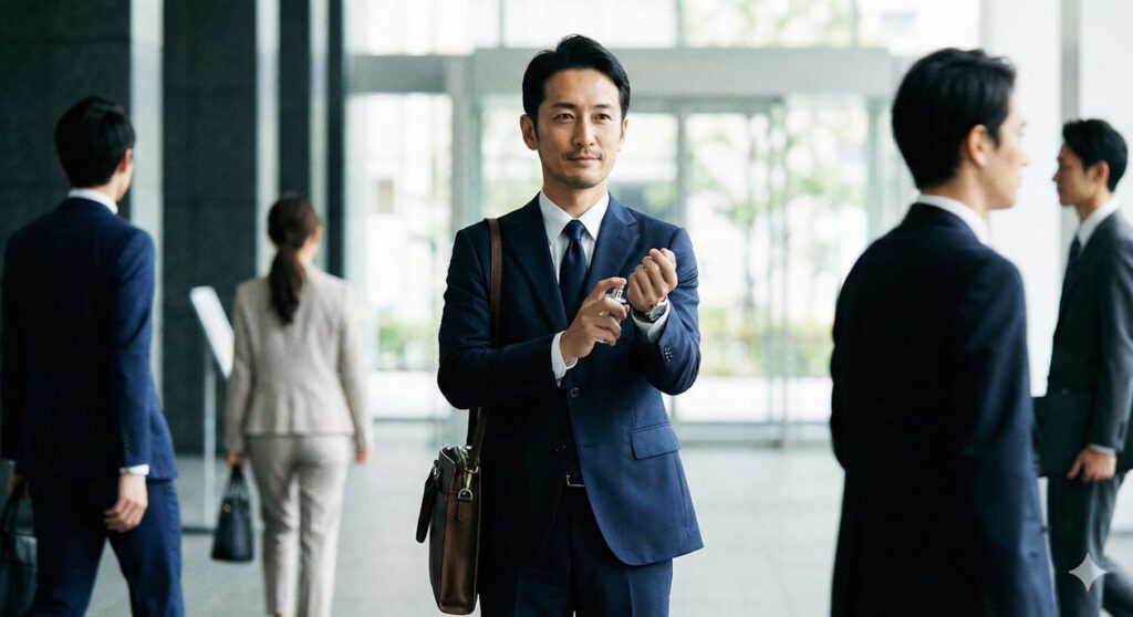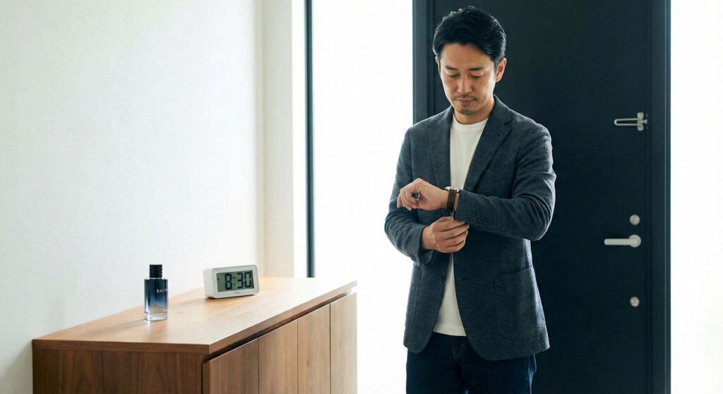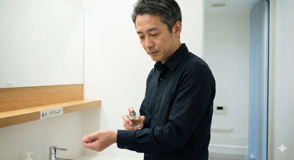 付けてすぐは、香りが一番尖っている状態です。30分前に済ませておけば、ちょうど香りの角が取れて、肌に馴染んだ「一番いい状態」で目的地に到着できます。「家を出る直前の追いプッシュ」は、失敗の元なので厳禁ですよ。