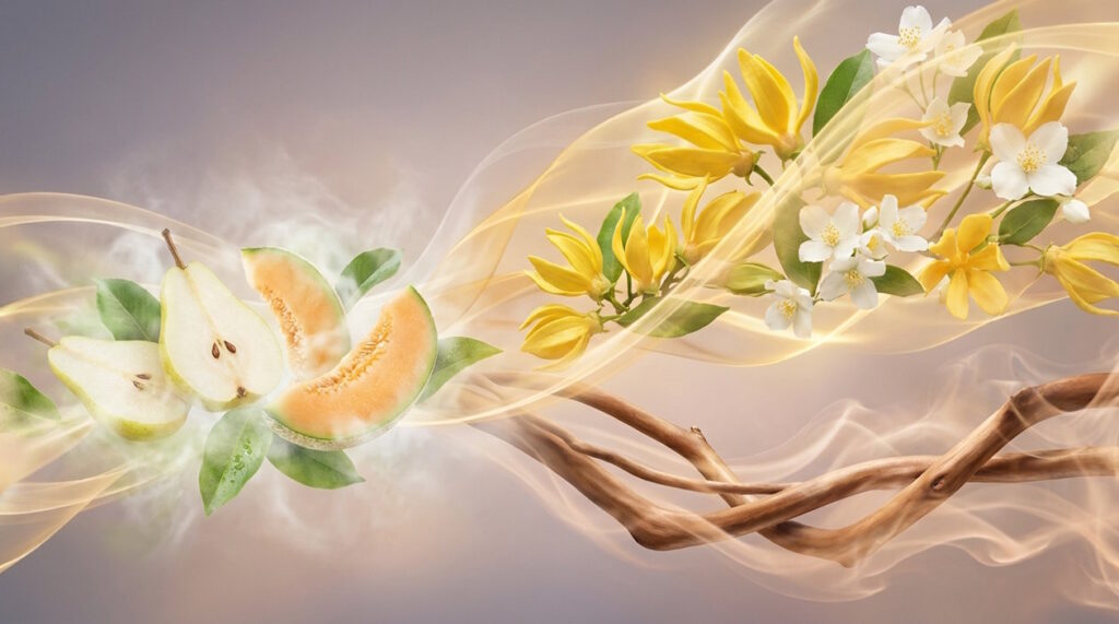 つけた瞬間、セイヨウナシやメロンのようなフレッシュで爽やかなフルーティ感が広がる。「フローラルな香水」と思って嗅ぐと良い意味で裏切られる、軽やかで明るい入口。 - 「イランイランとジャスミンの陶酔する核心」