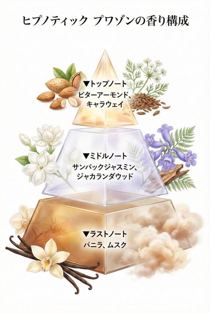 専門用語をできるだけ使わずに表現すると、ヒプノティック プワゾンはこんな香りです。