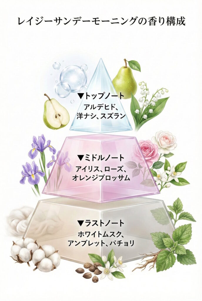 | ラスト | ホワイトムスク、アンブレット、パチョリ | 「肌の温もり」:清潔感が肌に馴染み、優しく持続する |